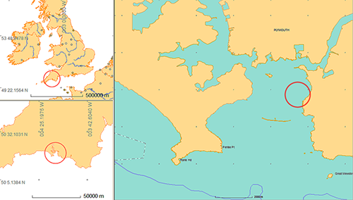 The visible part of the submerged wall is 574m long, lying in a north-east to south-west direction (225°) with the northern end at 50° 20.841 N 004° 07.515 W and the southern end at 50° 20.622 N 004° 07.846 W.