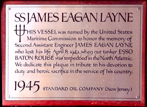 THIS VESSEL was named by the United States Maritime Commission to honor the memory of Second Assistant Engineer JAMES EAGAN LAYNE, who los his life April 8, 1942, when our tanker ESSO BATON ROUGE was torpedoed in the North Atlantic. We dedicate this plaque in tribute to his devotion to duty and heroic sacrifice in the service of his country.