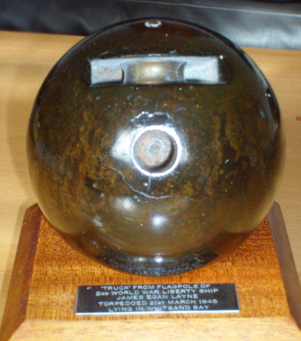 The truck from the top of the flagstaff that was mounted on the bows of the Liberty ship James Eagan Layne. The truck is circular in section, domed at the top with a small cut out off the centreline that is fitted with a small brass sheave.