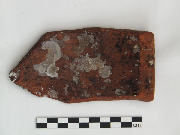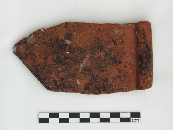 This broken and eroded fragment of terracotta pot was found south west of Tinker Shoal. The pot is made of red fabric with a glaze visible on the inner surface. The pot has no markings or decoration.