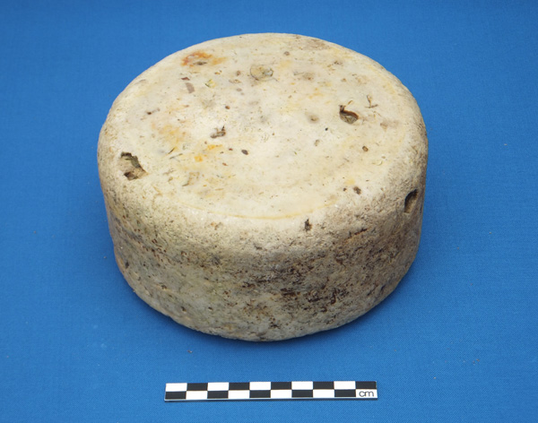 This small holystone was found near the wreck of the Greek brig Taxiarchos, lost on Rame Head in 1843. The holystone is made of pumice rather than the more usual sandstone and is well polished on one side. On the upper side is a square hole cut diagonally into the stone with the remains of a piece of wood at the lower end.