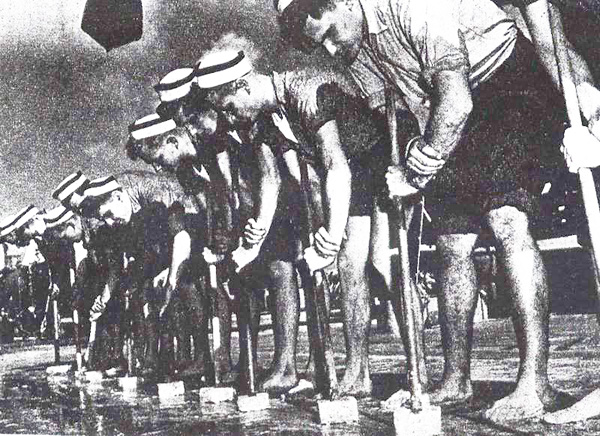 Holystones being used for scouring the deck of a ship |