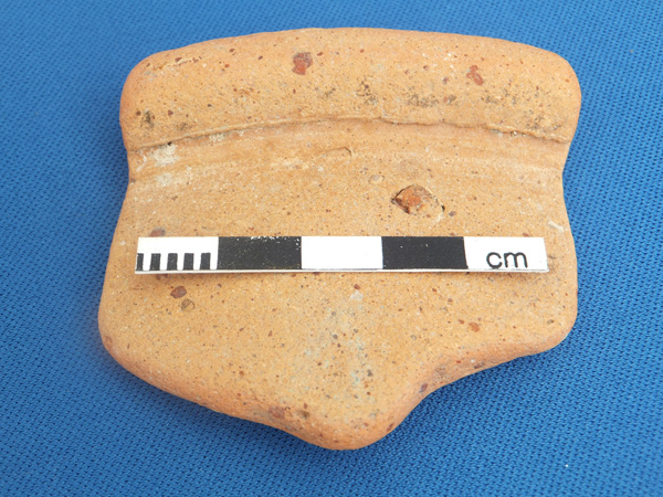 This small pot body shard was recovered from near Tinker Shoal having been found loose on the seabed. Made of a coarse yellow/red fabric with some inclusions and a simple decoration under the rim.