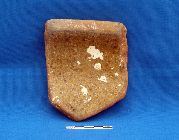 An eathenware rim fragment made from red/brown fabric with inclusions, 11mm thick, unglazed on the outside and with a light brown glaze on the inside. The original pot would have been approximately 290mm in diameter. This pot sherd was found 800m south of Penlee Point.