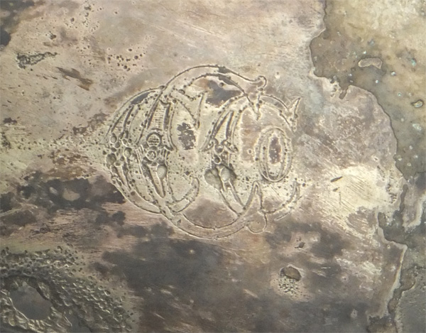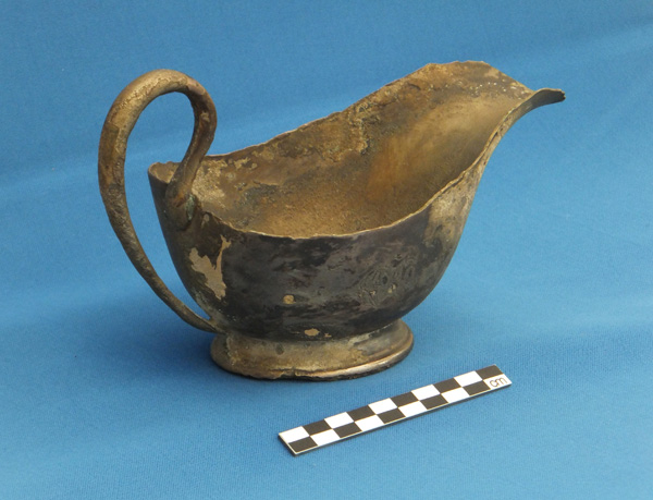 A metal gravy boat found at the entrance to Millbay Docks. The body is partly corroded and has a number of small holes through it, the makers mark on the underside is also corroded apart from the word 'London'. On the side is engraved 'C C Co.'