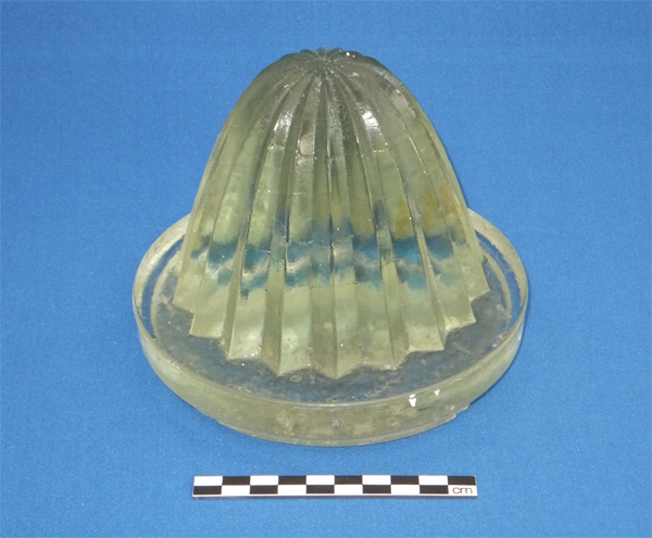 This object would be used to provide light below decks in a wooden ship using a method that was safer than using candles. The prism would have been fitted into the deck of a ship with the flat side uppermost at deck level. Light would pass through the flat side and shine through to the deck below, diffused in all directions by the patterned glass. The flat surface of the deck light shows abrasion and wear from sailors walking on it when it was fitted into the deck.