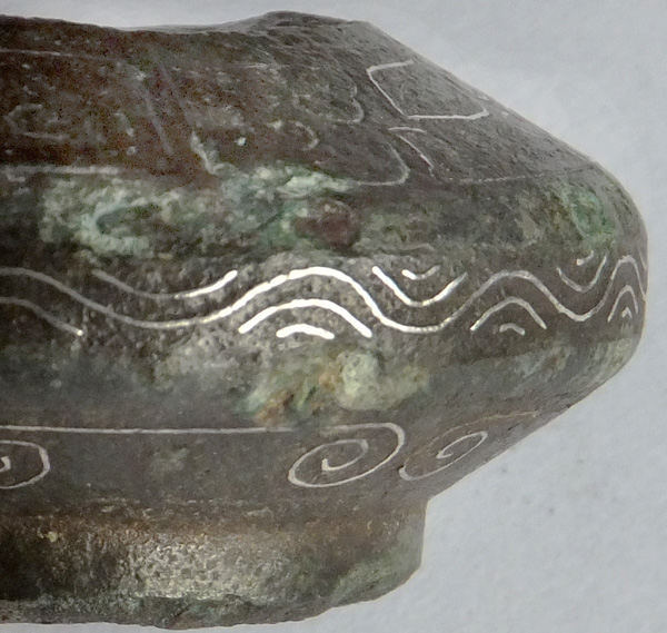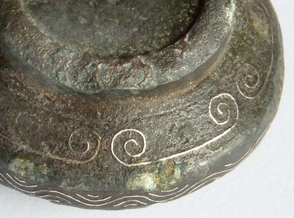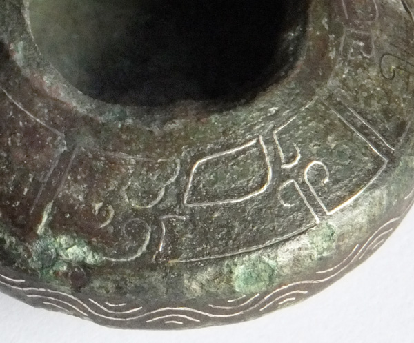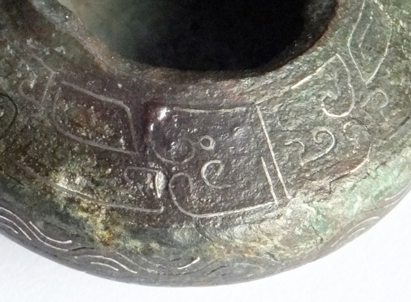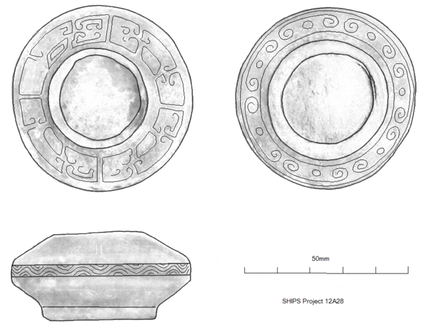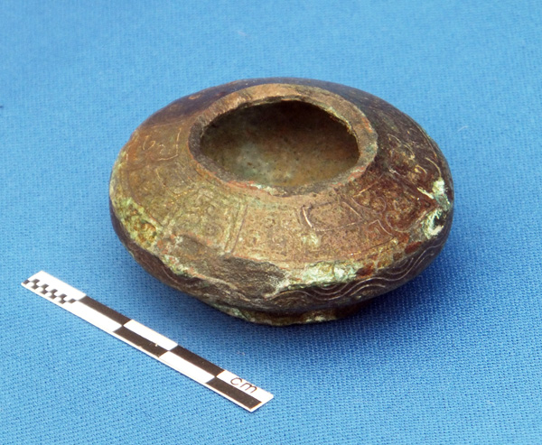 The pot is biconic in shape with a round base 3mm high and has a wall thickness of 3mm. The top, sides and bottom of the pot are decorated with inlaid gold coloured wire approximately 0.25mm in diameter. Although much of the inlaid wire is missing the pattern of the very detailed decoration can still be seen, the pattern on the top is repeated four times and on the underside is repeated seven times. The 5mm high flat side of the pot shows a repeating wave pattern with one continuous line and pairs of truncated lines above and below.