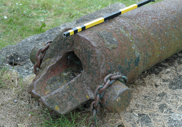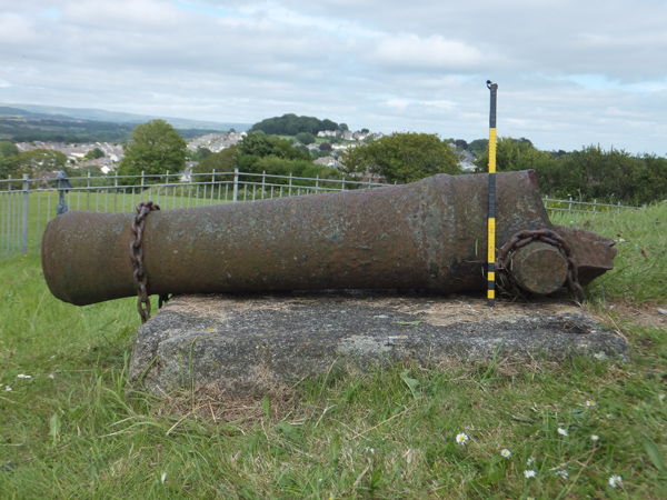 This gun is mounted on a war memorial on Burrow Hill in Plymstock. The breech of the gun aft of the trunnions is missing, it appears to have been damage ins ervice rather than a deliberate cut. The origin of the gun is not known.