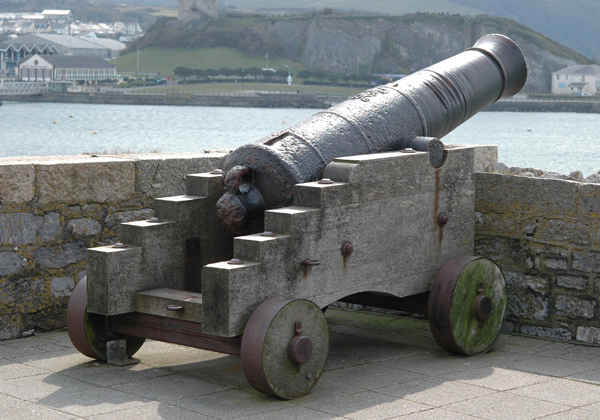 One of two Blomefield pattern guns mounted on replica carriages at Fishers nose. This gun is in good condition with detailed mouldings but it has been used as a mooring bollard and shows signs of wear from wire hawsers.