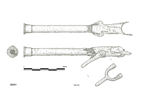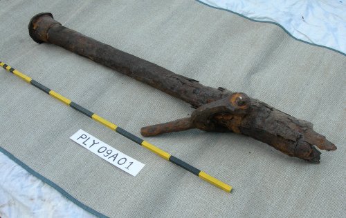 Incomplete wrought iron swivel gun found during dredging work off the Bear's Head in the Cattewater. The internal staves that form the barrel were originally covered with hoops and bands which have now corroded away. The muzzle is complete, has a flat face and includes a central foresight, one band remains behind the muzzle ring and another in front of the trunnion hoop. The swivel yoke is complete. Only part of the chamber holder remains.