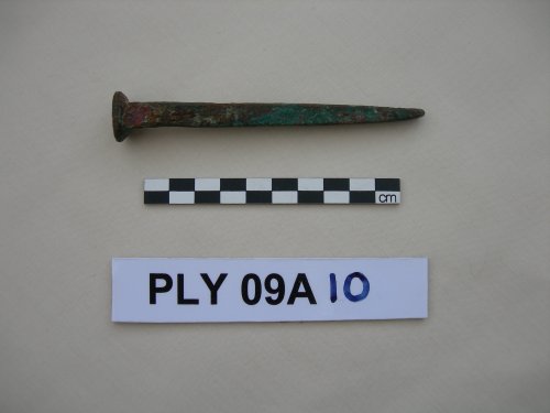 Copper alloy nail found on the Offshore Coronation site. The nail is 122mm long, 9mm square section tapered at the end with a 20mm diameter round head.