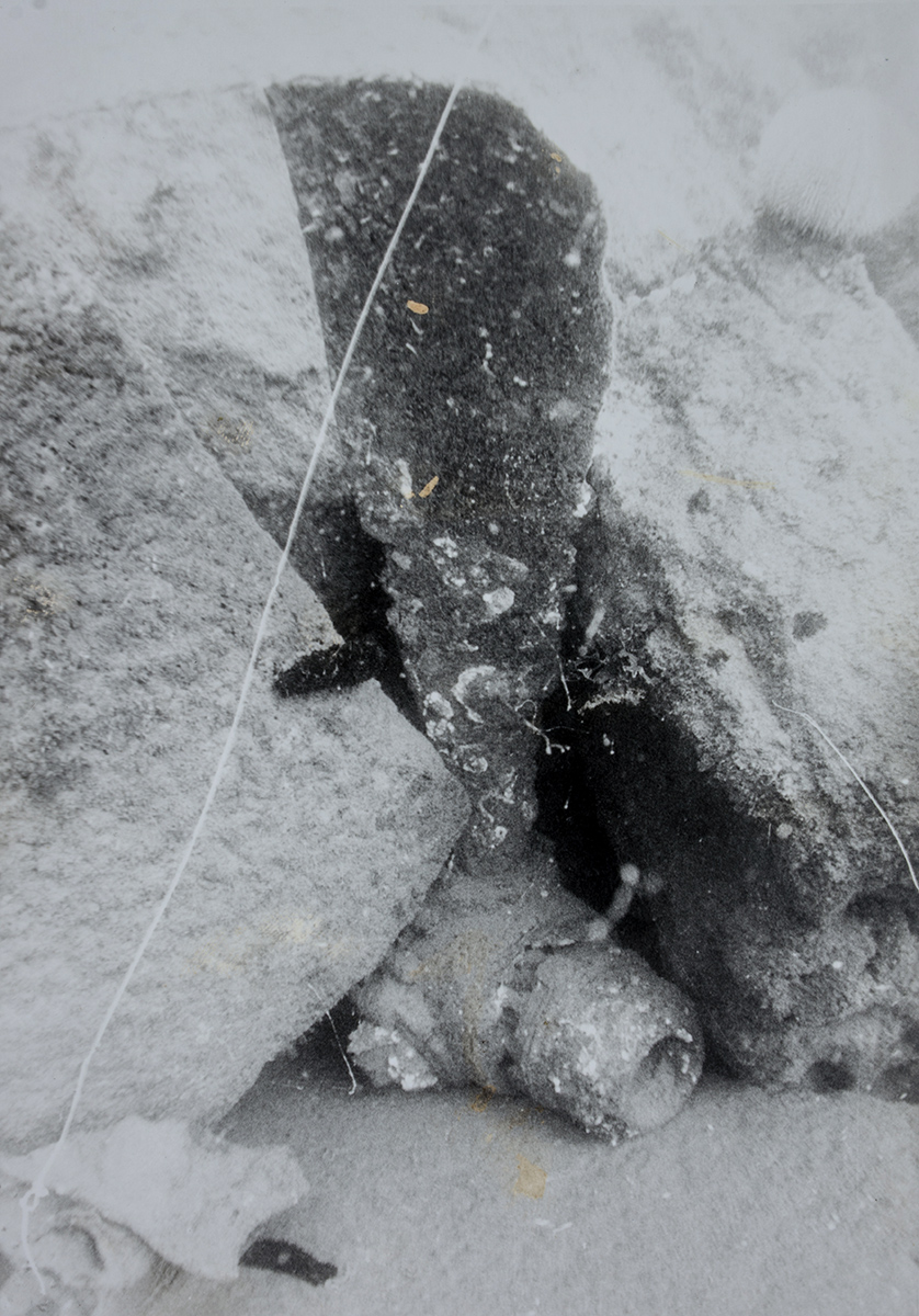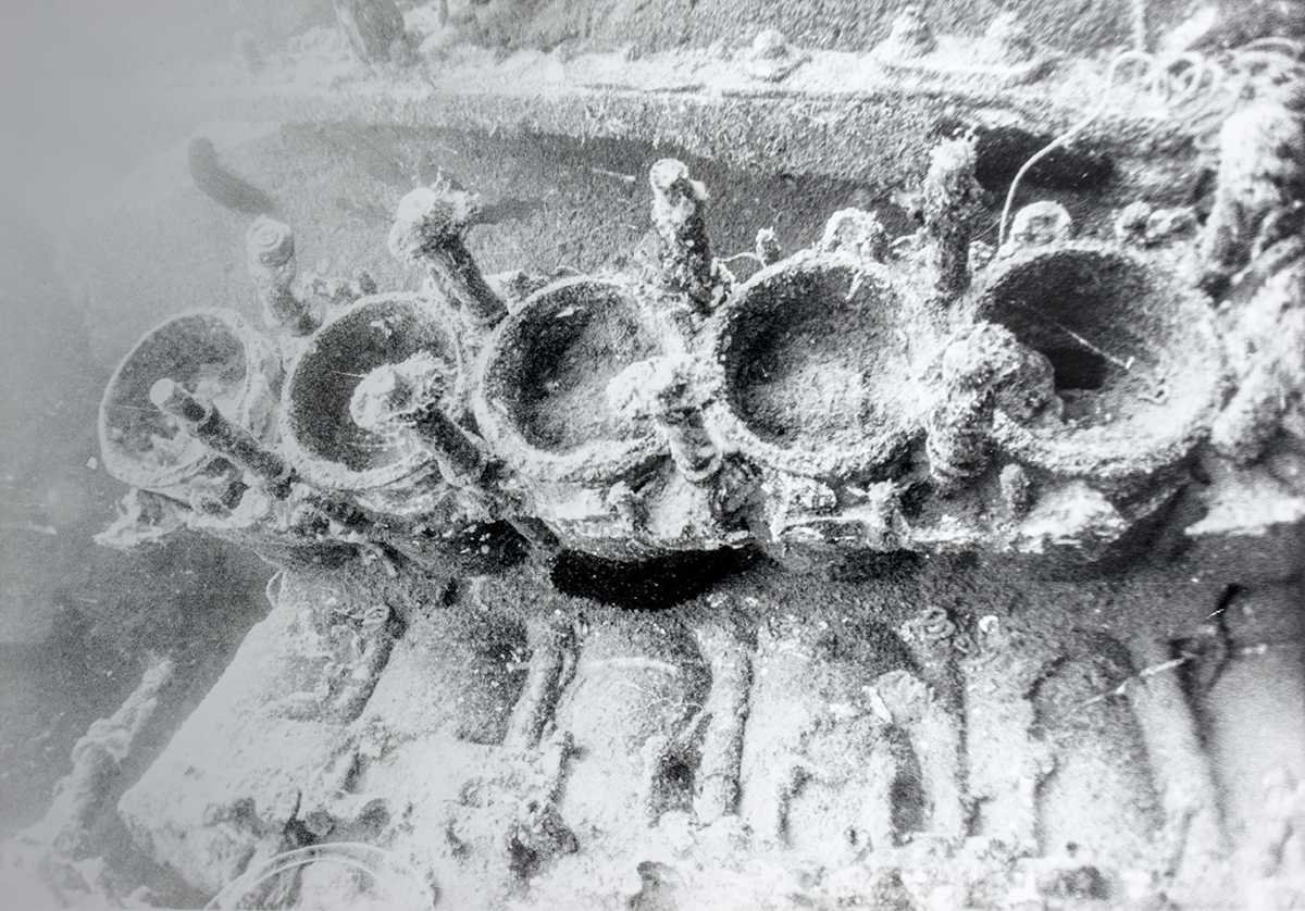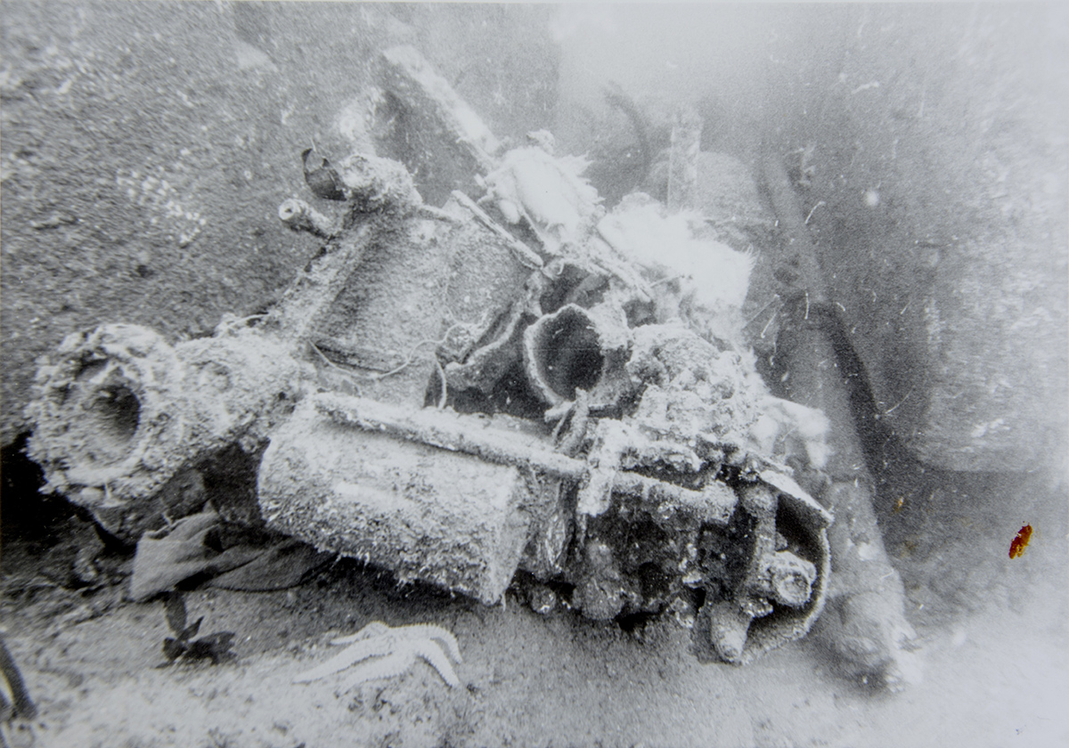The well scattered remains of the Lancaster bomber were found by Exeter BSAC on 13th April 1975, on the south side of the Breakwater at the western end in a depth of 15m. On 22nd November 1975 the Devon Aircraft Research & Recovery Team (DARTT) assisted by local divers recovered one of the Packard Merlin engines and one of the front oleo legs with an intact and inflated tyre.