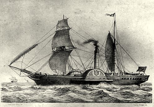 The 806 ton passenger steamship Ajax was built in Liverpool in 1843 by Vernon & Co. at a cost of £32000. Her 400 h.p. engine supplied by Berry, Coutis & Co. drove the steamer’s two side paddlewheels yet she also carried a schooner rig in case the engine failed. Operated by the Cork Steamship Company, the Ajax ran the route from London to Cork with a stop in Plymouth and was considered the finest steamer on the line. The vessel could transport over 300 passengers and finish the journey in less than 30 hours, making it a very popular vessel.