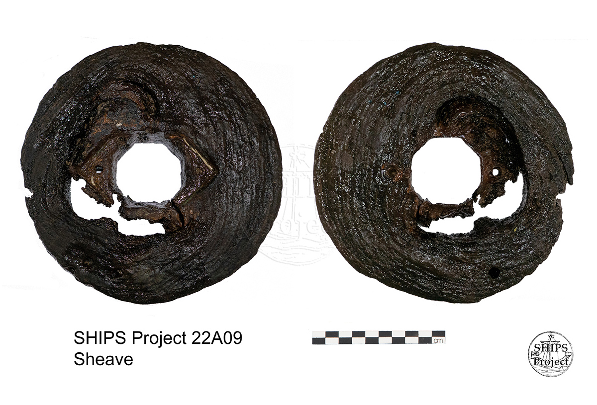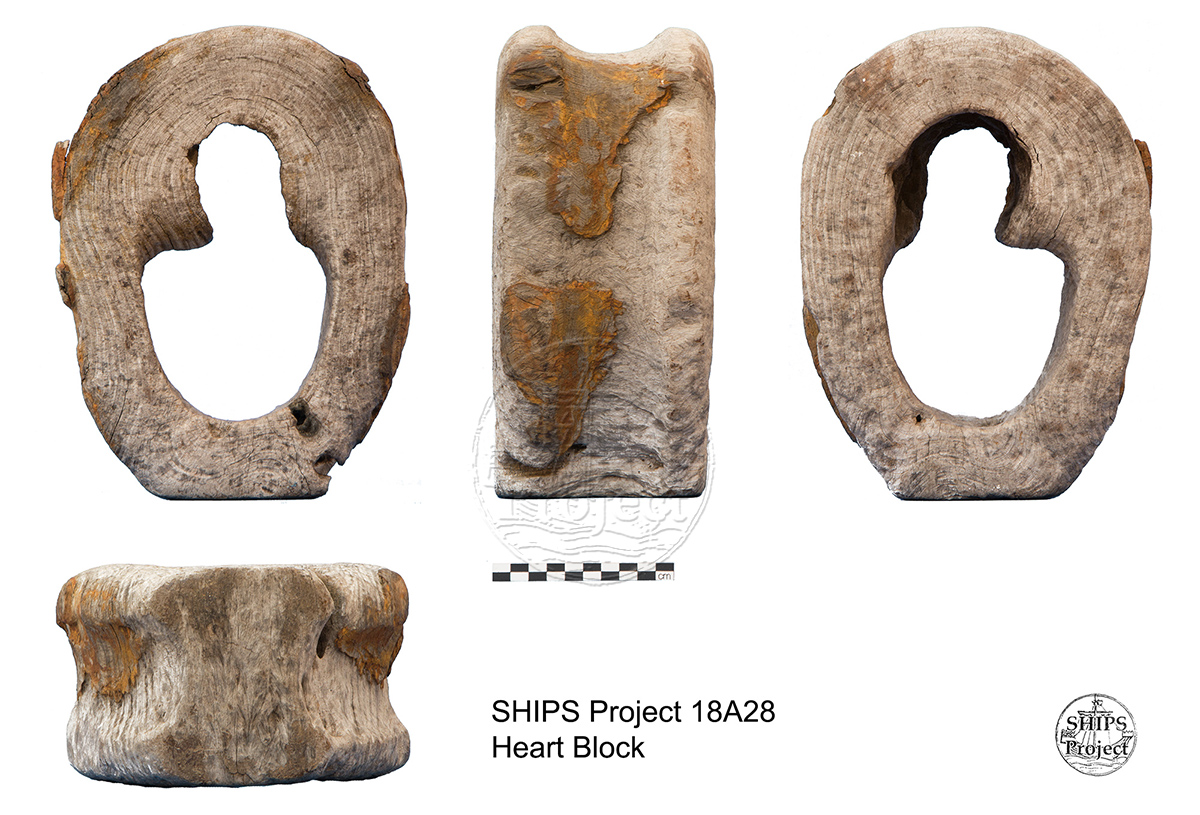 This heart block (18A28) was excavated from soft sediment when the site was first investigated. This is a heart block, a block without a sheave which was part of the standing rigging on the ship used in pairs to join a mast stay to a collar around a mast, with lanyards to provide the tension between the blocks. The stay or collar would be fitted around the outside of the block, in this case with a single turn and the large hole in the centre is chamfered to take the lanyards. The rope around the outside of the block would be approximately 100mm (4in) in diameter.