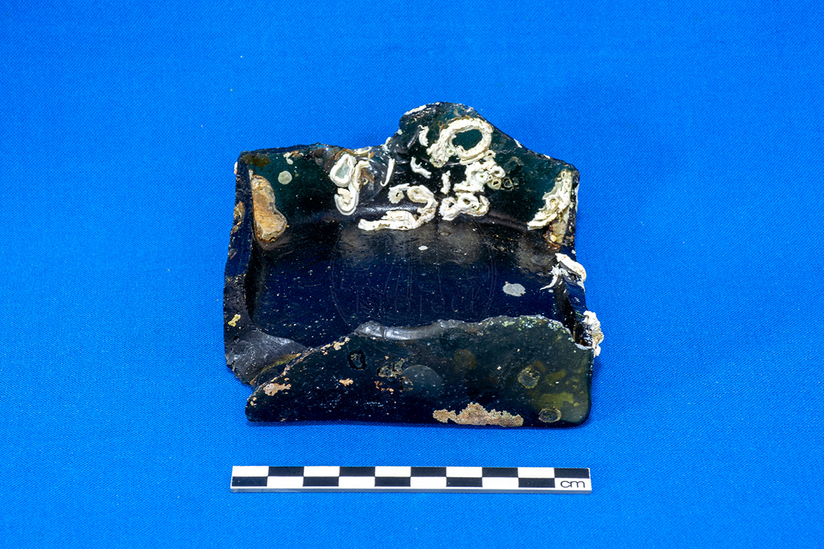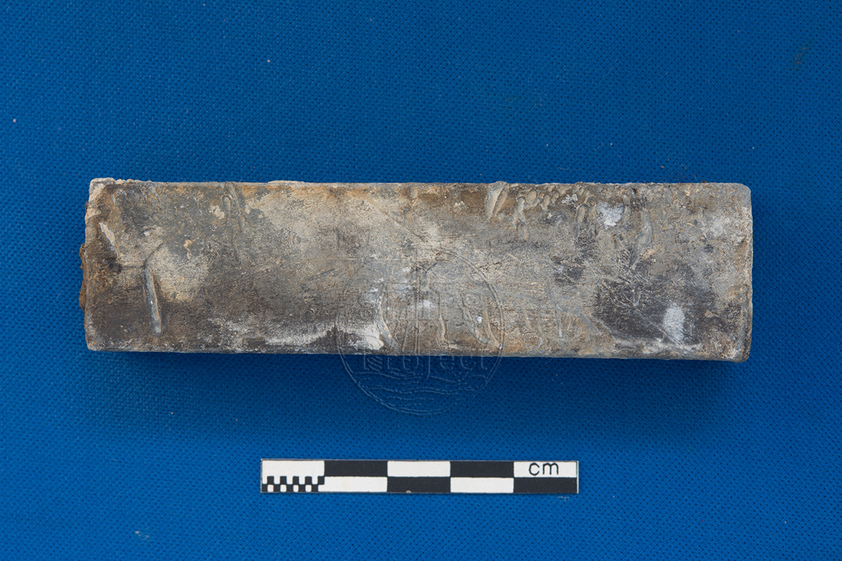 A small lead ingot was found on the wreck. The ingot has straight, flat sides, no markings, and was cast in a vertical mould with remains of the casting sprue is visible at one end. This ingot is similar in design to the larger silver ingots recovered from the VOC ship Rooswijk (1739). This ingot is unusual because of its size and shape. In the 18th Century lead as cargo was transported in large boat shaped ingots or in rolls of thin sheet. Ships often carried lead in rolls to use as 'tingles' or patches for repairing leaks or to make protective coverings. This ingot is unusual as it is so small and so well made, it appears to be cast in a parallel sided vertical mould which would be more time consuming and expensive than the more usual open topped boat-shaped moulds.