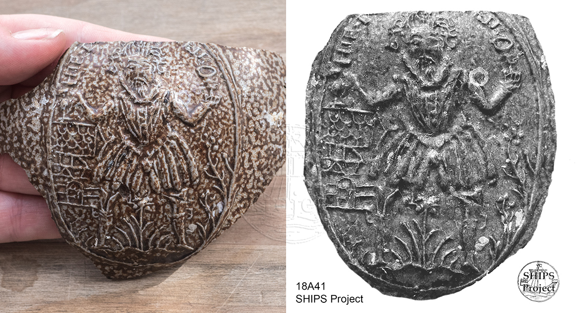 Pottery found on the site includes pieces of Bartmann or Bellarmine jar. Bartmann jugs are a type of salt glazed stoneware manufactured in the Rhineland in the 16th and 17th century, particularly from Cologne and Frechen. By the early 17th century there were large exports from the region to England, with stoneware jugs and bottles shipped across the channel by the thousands. One of the pieces includes a medallion from the belly of the jar (18A41).