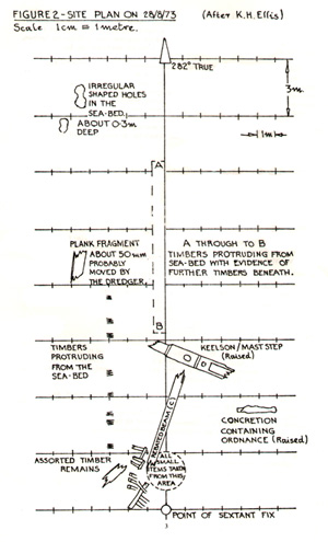 The next series of dives in July and August allowed Ellis to sketch the first preliminary site plan. It was hoped that the extents of the wreck could be found by probing the silt to find timber contacts but this was hindered by stones below the surface measuring up to 150mm in diameter. Some proved to be local stone but some were not suggesting that there may be ballast from more than one ship in the area. The dumping of ballast in ports and harbours had been a problem up to the beginning of the 19th Century.