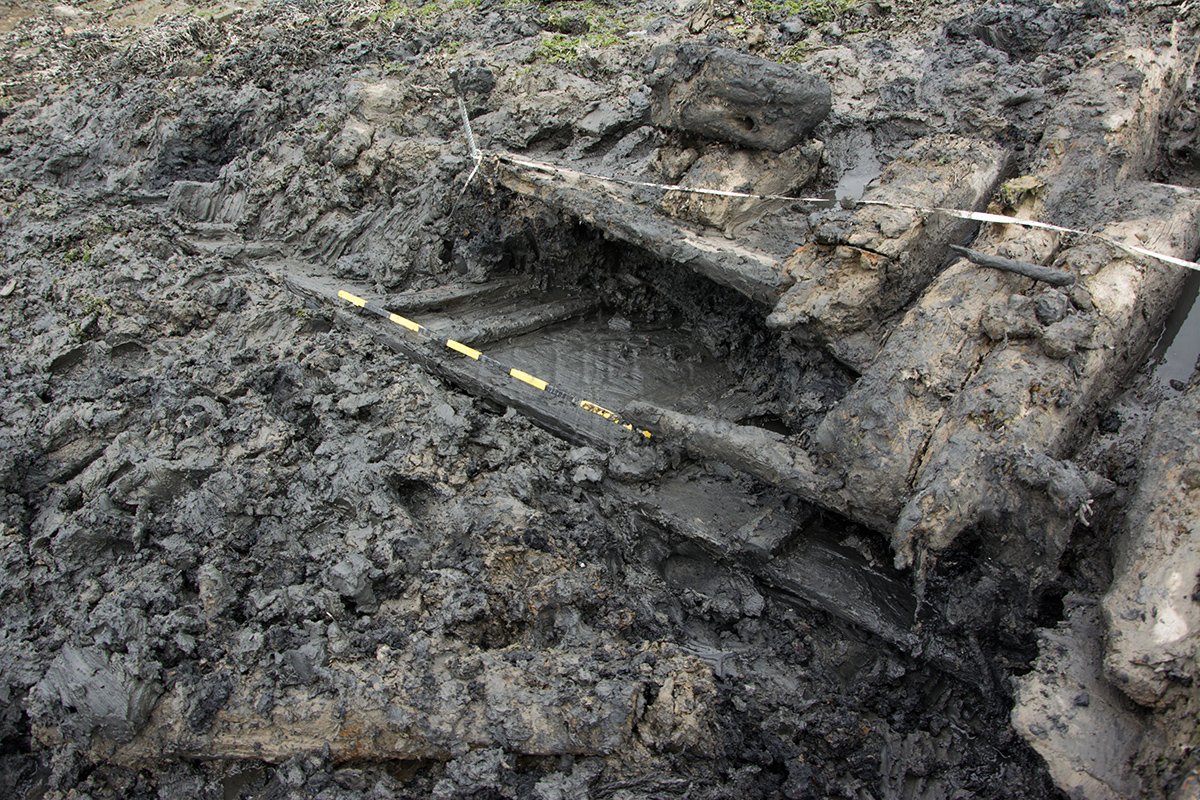 The lower part of the vessel is all that can be seen, including keel, lower frames and outer planking, largely covered by the much more heavily built Hooe Lake 4.