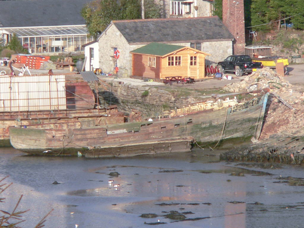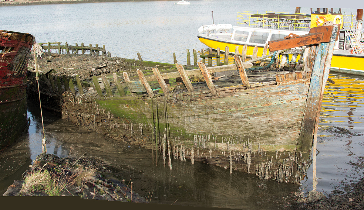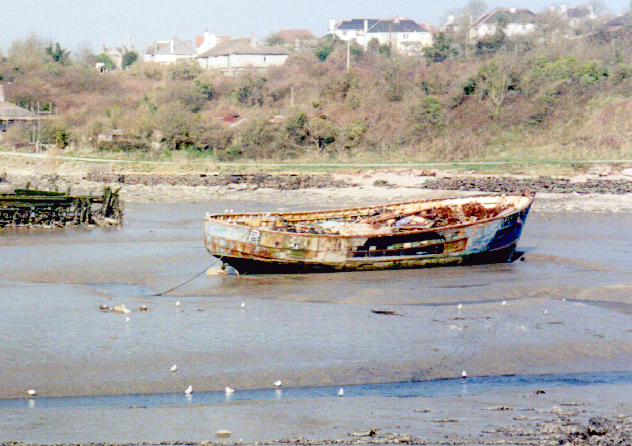 Remains of a fishing vessel on the southern shore of Hooe Lake, near Oreston in Plymouth.