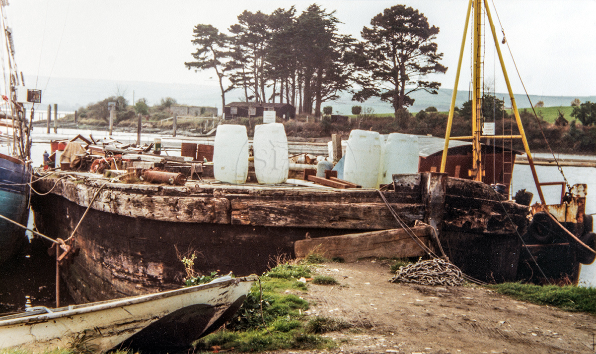 The owners of the Carbeile boatyard extended the wharf along the foreshore, Brian Jones saw the wharf being built and took some photographs (Photos 2 and 3). Along with the Reine des Flots were a cut-down steel-built Admiralty vessel, an unnamed trawler with port number SU-104, the yacht Roy Fra Masnedo, barge Fowey No. 2 and approximately four other vessels. The boats may have been cut down before being infilled because the area now is flat concrete, used for a boat park and storage.
