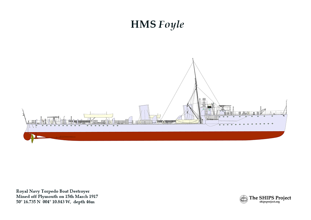 The official account of Royal Navy vessels lost in WW1 states that on 15th March 1917, the bow section of the Foyle was blown off by a German mine in the Dover Straits, killing 27 of the 70 crew on board. However, the captain’s report and Admiralty telegrams sent at the time state that the ship was patrolling the area off Devon known as the eastern area at that time. In the captain's report, Lt. A.H.D. Young said that early in the morning of 15th March, Foyle hit a contact mine when just over 3 miles to the east of the Eddystone lighthouse, at position 50°11'N 03° 58'W. The minefield was probably laid by the German submarine UC-68 on the night of the 13th/14th March.