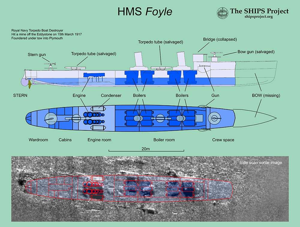 The Foyle hit the mine on the port side bow; the huge explosion heavily damaged the bow and destroyed some of the mess decks forward. Sonar records suggest that the forward 10m of the ship is missing. The bow was probably destroyed by the force of the explosion, so it is unlikely that any of the ship remains on the seabed at the location where she hit the mine.