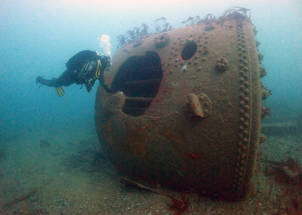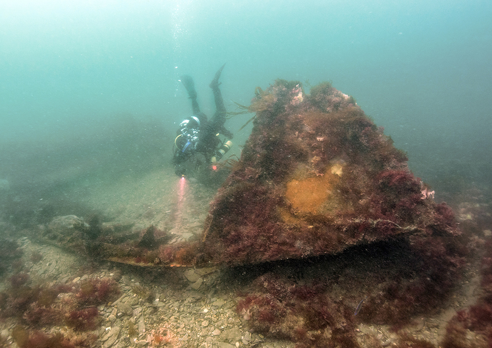 What remains of the ship is the single large boiler, part of the bows lying on its starboard side, sections of hull plating amongst the sand flats, reefs and gullies of the seabed. The site has changed a lot over the years, with the ship structure slowly collapsing, but also because the seabed itself has changed. Photographs from the 1990s show the site covered in kelp and deep sand with very little structure visible, but today both the kelp and the sand have gone, revealing a large area of iron wreckage. The boiler is the easiest to find as it stands proud of the seabed, and to the west lies the remains of the engine bed, the engine having been removed before she sank. To the south can be found the stern with wooden decking, mooring bitts and the steering quadrant that was fitted to the top of the rudder. Heading north, more structure is visible along the port side of the ship, past the boilers and over an area of bottom plating. The anchor windlass can be seen lying upside down on the sand. North again is a large structure that was the bow, lying on its starboard side with the sharp stem still clearly visible. Going south along the starboard side, you can see an area of decking turned sideways with a round hole through it for a ventilator; the wooden decking is still visible.