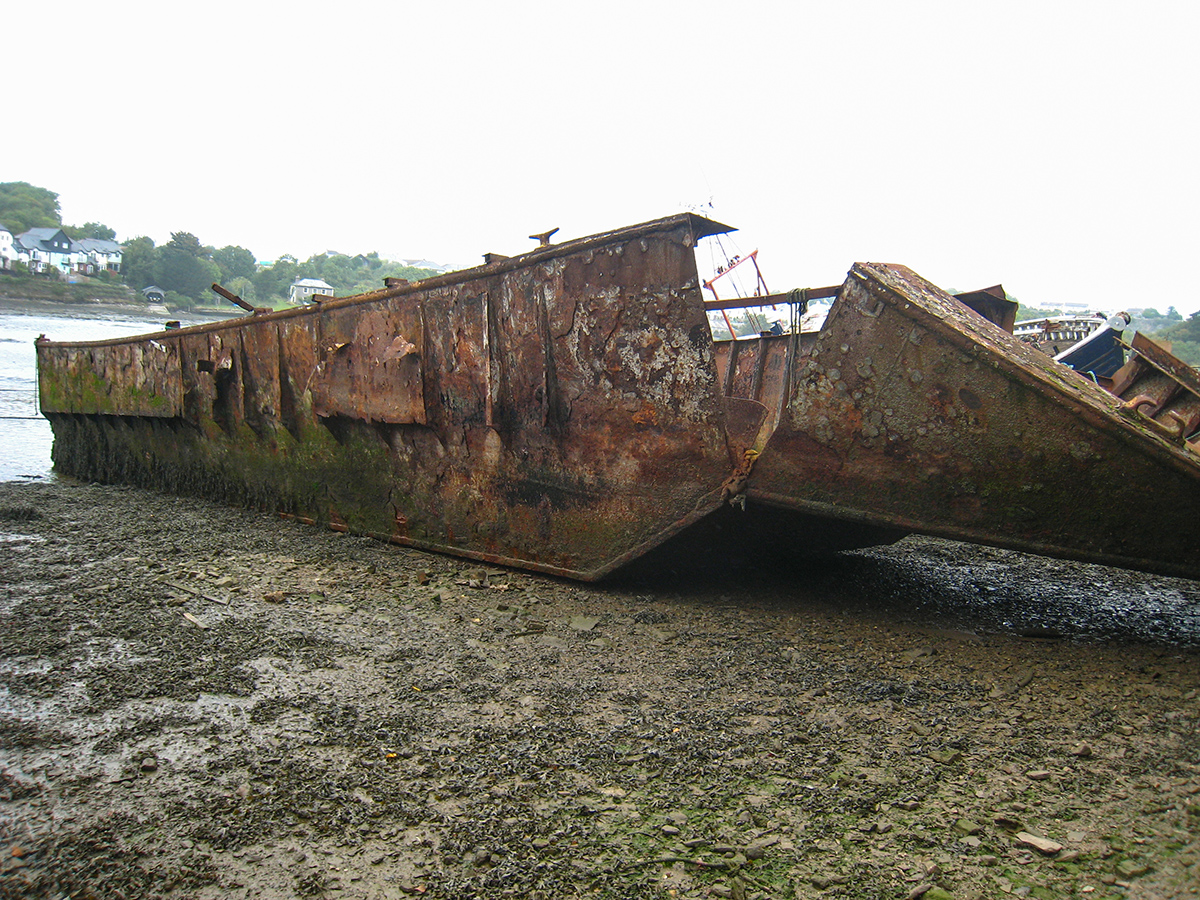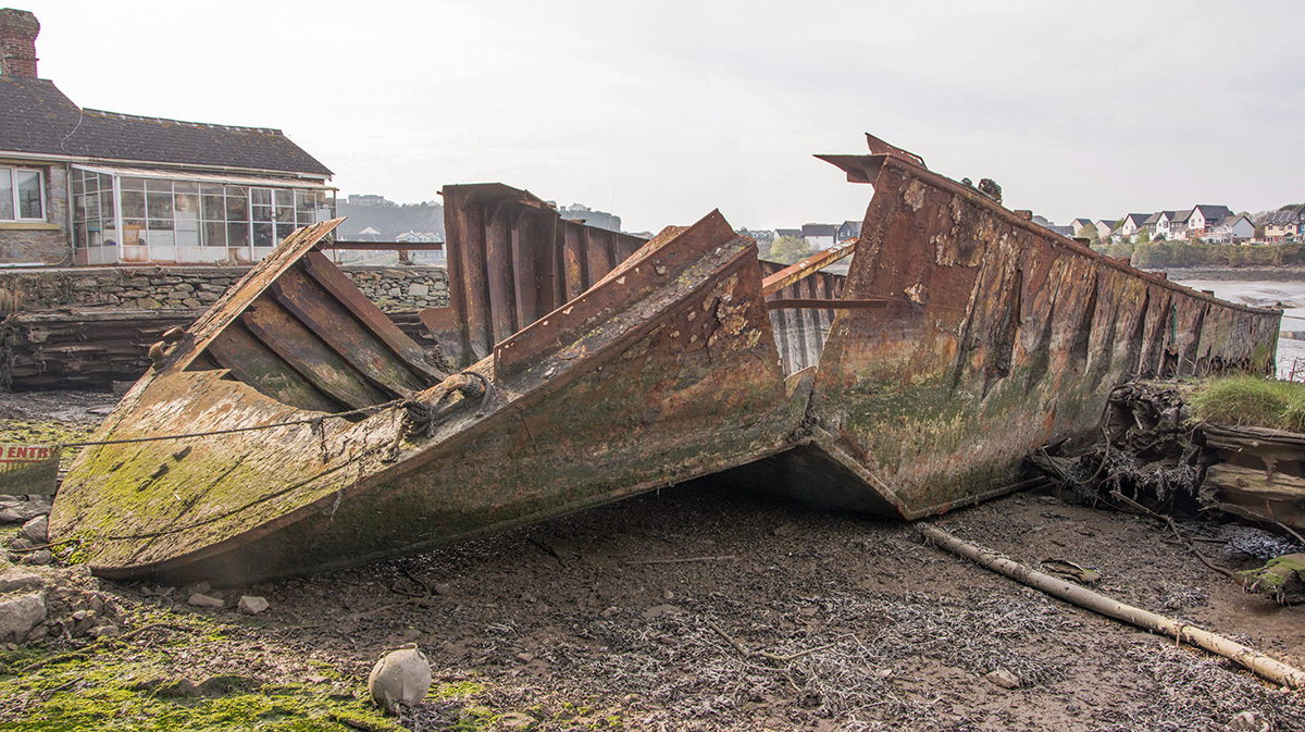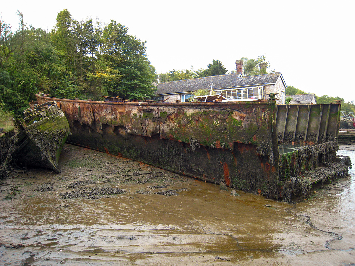 Remains of an unknown steel barge on the southern shore of Hooe Lake, near Oreston in Plymouth.