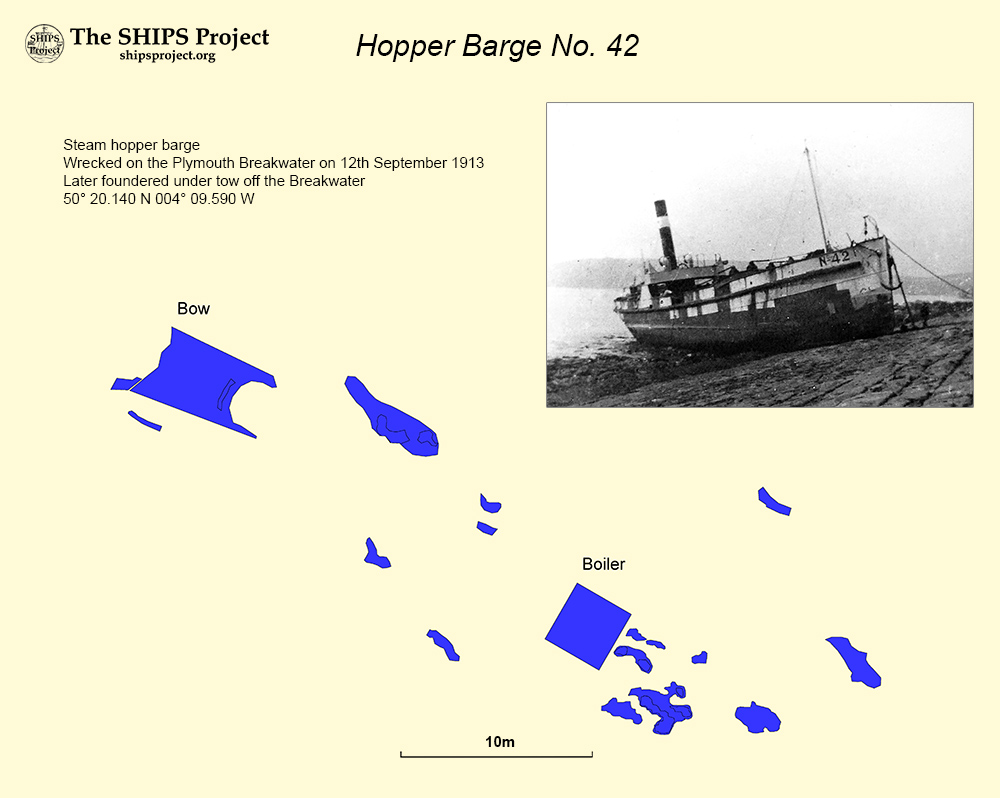 The Hopper Barge No. 42 wrecked on the Plymouth Breakwater and sank under tow during the attempted salvage.