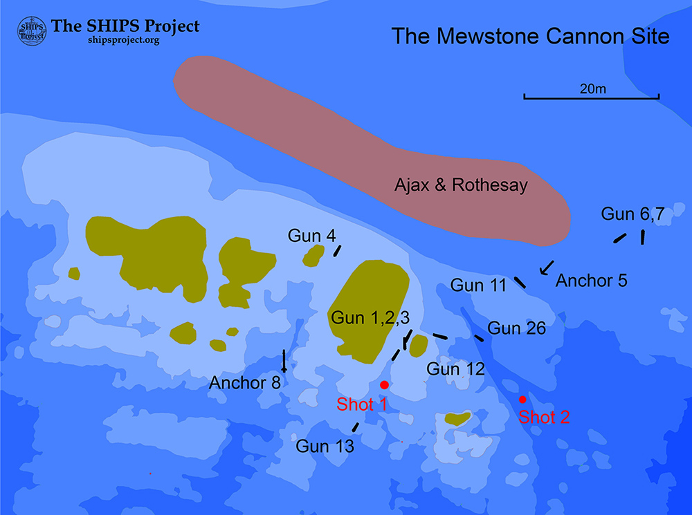 Site plan of the Ajax and the Mewstone Cannon Site by The SHIPS Project, click the image for a larger version