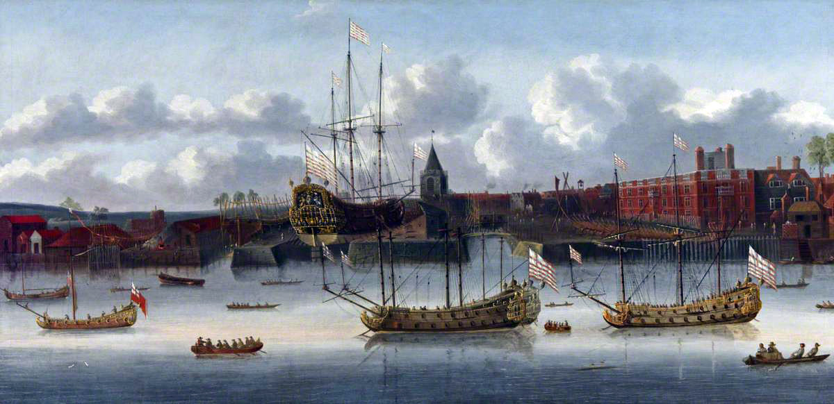 Deptford Yard in 1660 with a large Indiaman on one of the two slips and two smaller vessels at anchor in the river (NMM)