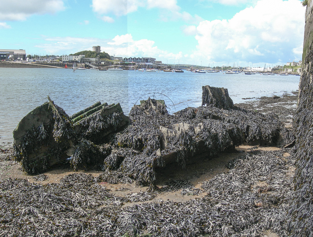 The remains of the Plym dredger lie on the foreshore off Cattedown.