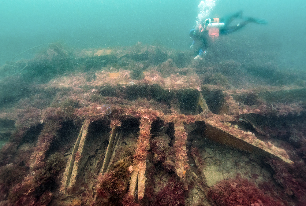 The vessel sustained heavy damage and is now scattered across the seabed between reef outcrops a few metres high running approximately north/south. Most of the debris is low lying and covered with seaweed during the summer months making it difficult to distinguish wreck debris from the underlying seabed. Small bits of broken pottery are scattered across the site. Machinery, such as the engine and deck winches, and ship’s structure remain on the seabed to be explored.