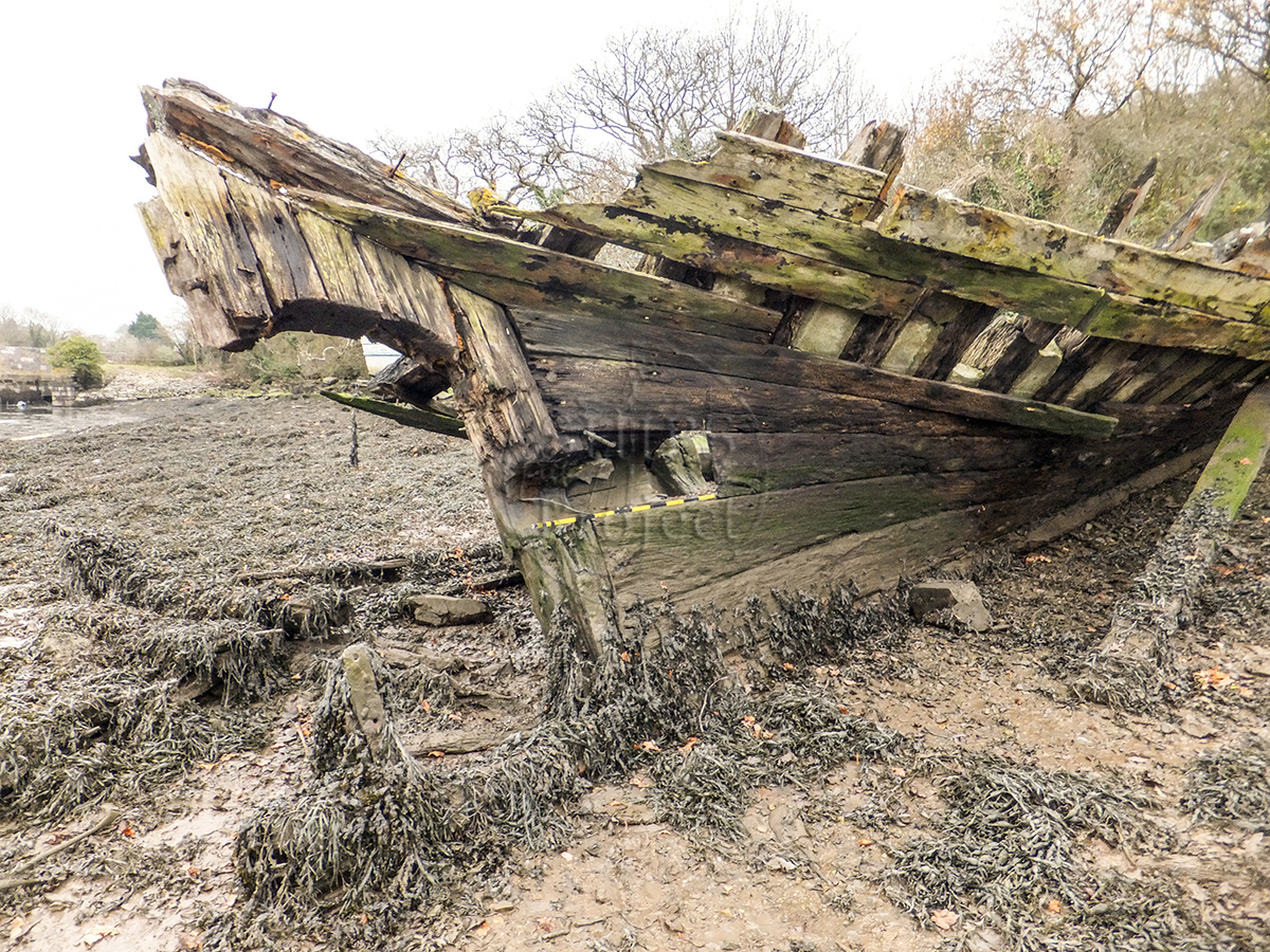 From Oreston, take the Lower Saltram road off Plymstock Road then turn right into Kingfisher Way. Follow the road down to the lake and there is a car park at the end. The remains of the Roger can be seen on the south bank of the lake. Take the footpath heading south under the folly and follow it round to the hulk, there is a gap in the bushes where you can walk through to the beach. Alternatively, walk round via the beach but take care as the rocks are slippery. The wreck partially covers at high tide springs so plan a visit to coincide with low water. The foreshore round the bow of the Roger is firm but the stern lies in mud so appropriate footwear is needed.