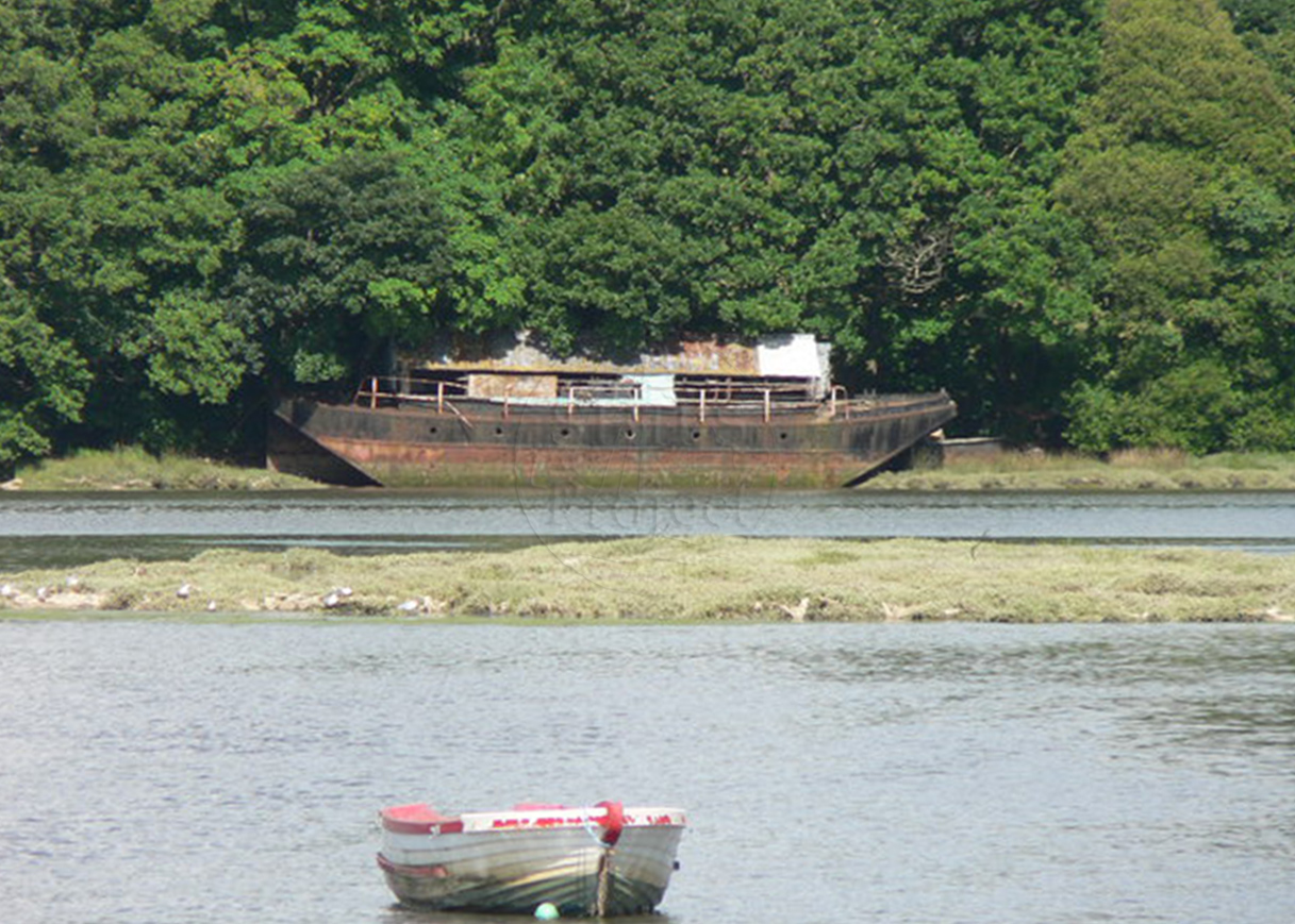 Farmer Simmons' abandoned barge 'Noah's Ark' lies under the trees on the north side of Tamerton Lake.