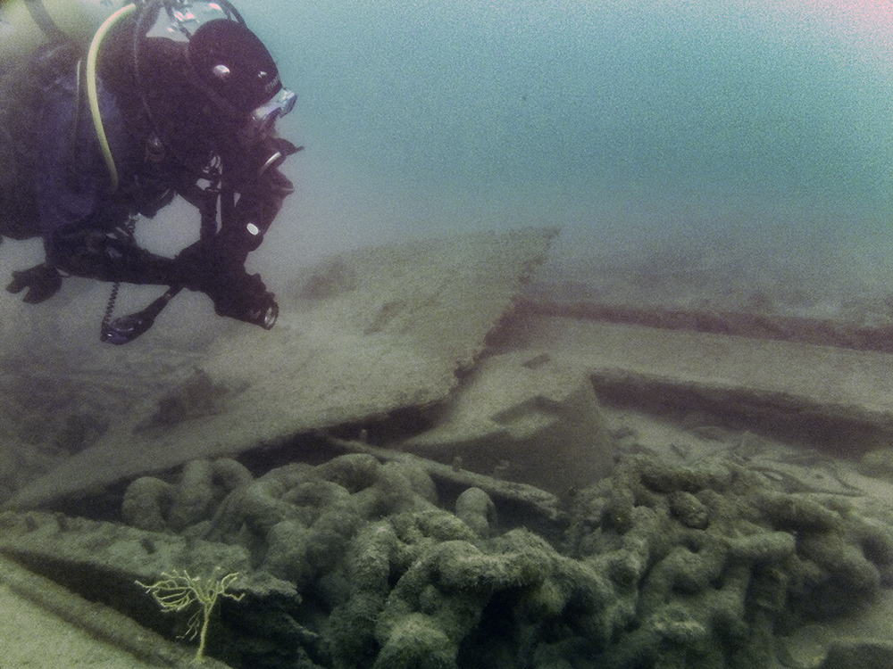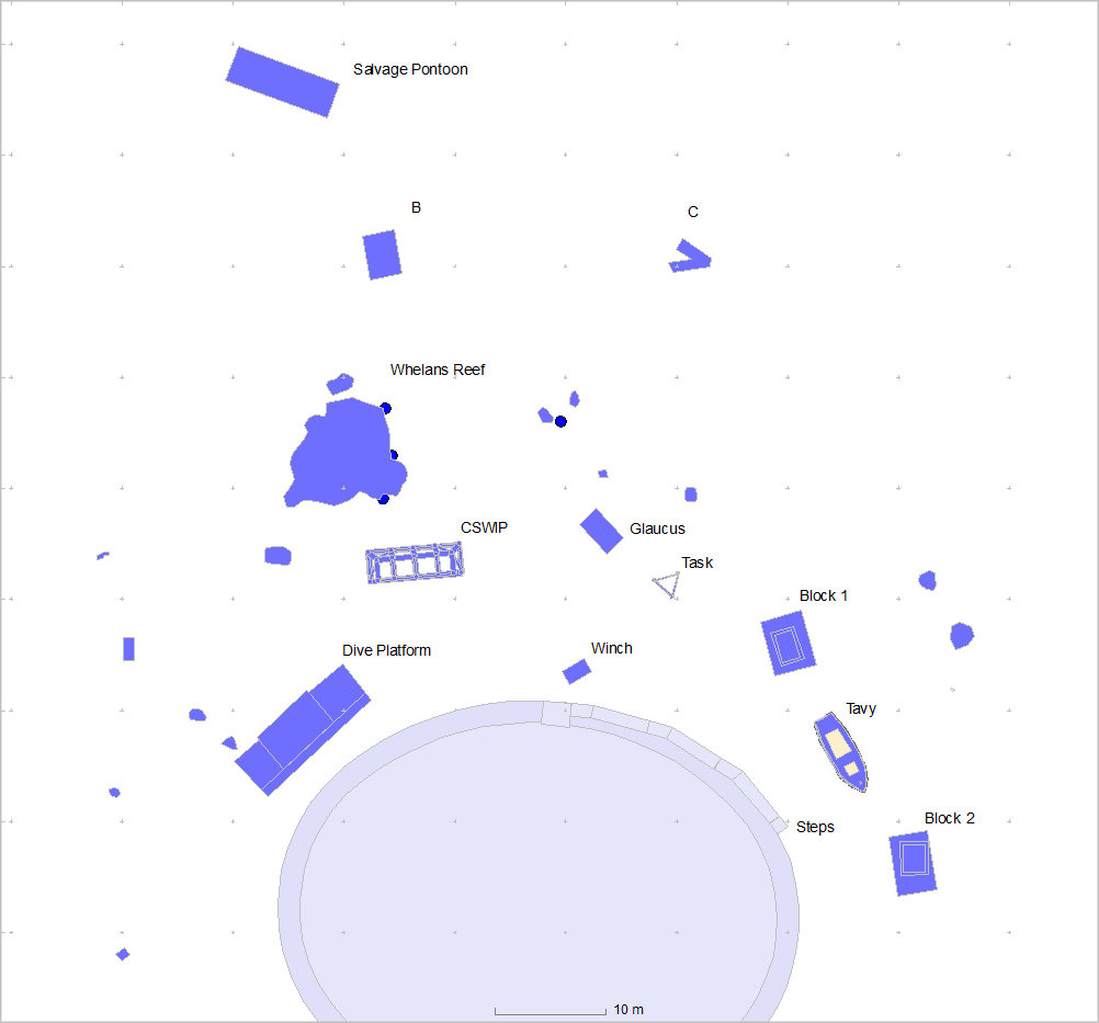 What remains of Tavy still lies between Blocks 1 and 2 northeast of the Breakwater Fort, partly buried in the seabed.
