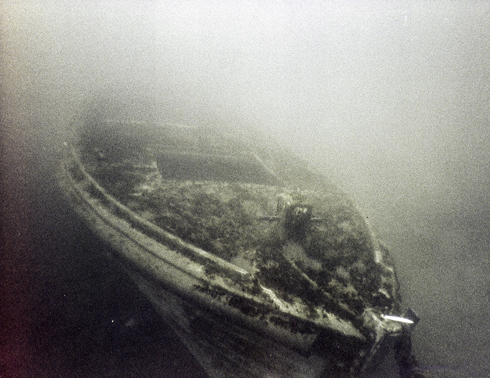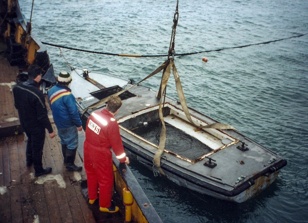 Tavy was prepared for sinking between August and October 1995 by volunteers including Kit McAllister, John Spencer, and Jon Parlour, who removed the wheelhouse, any loose objects and anything likely to snag on a diver’s equipment. Fortunately, most of the hard work had been done as the engine and steering gear had already been removed. Permission to sink the vessel was obtained by Nigel Boston and Alan Bax at Plymouth Ocean Projects, so the team were ready to go. Tavy was loaded on the deck of Nigel Boston’s large dive support vessel Terschelling, and she sailed out into the Sound on a calm day on Friday, 23rd December 1995, accompanied by a team of volunteers from PMARIG and a local TV crew. The big dive boat was secured to the fort in the right location, the small timber boat on her deck was prepared for scuttling, and Tavy was lifted over the side. The little wooden ship was loaded up with scrap chain and sinker weights, and she sank to the bottom, sheltered between the two large concrete blocks used for diver inspection tests.