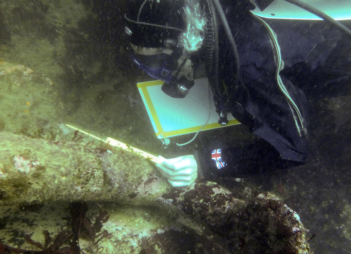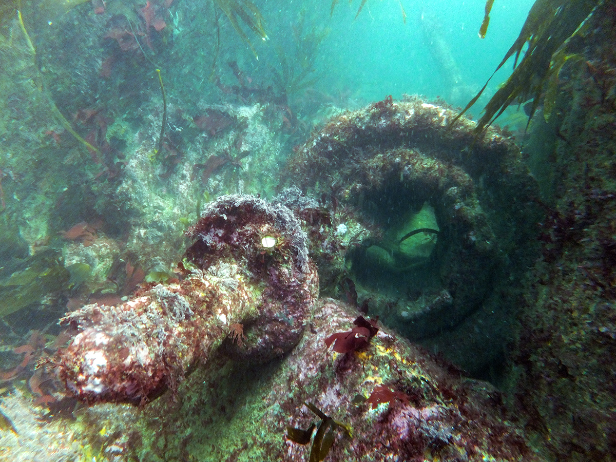 The remains of the ship were rediscovered in the summer of 1982 by local Plymouth diver and photographer, Dave Peake. While snorkelling around the rocky headland at Rame, Peake noticed an old round crown anchor though the kelp, it was badly worn and partly buried, but unmistakably an anchor. He then spotted two more anchors lying about 5m apart in a nearby gully, both larger than the first, these anchors measured 2.5m in length and had large arrow-shaped flukes. Peake noted that the surrounding seabed was strewn with other iron wreckage including winch gear, iron spindles and drums so he presumed that after the ship ran into the rocks, the bow settled and rotted away, thus leaving the foredeck gear and anchors. We now know that the ship broke up shortly after it sank leaving just the iron and brass fittings on the seabed.