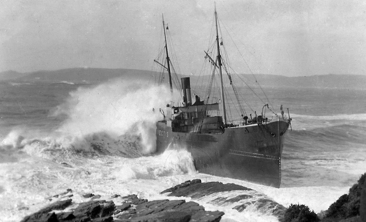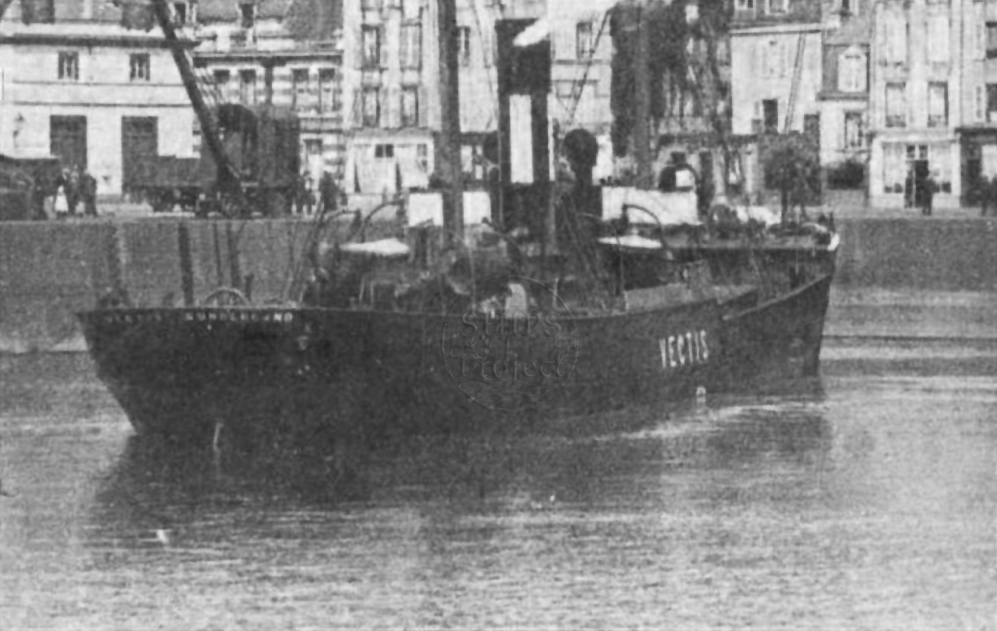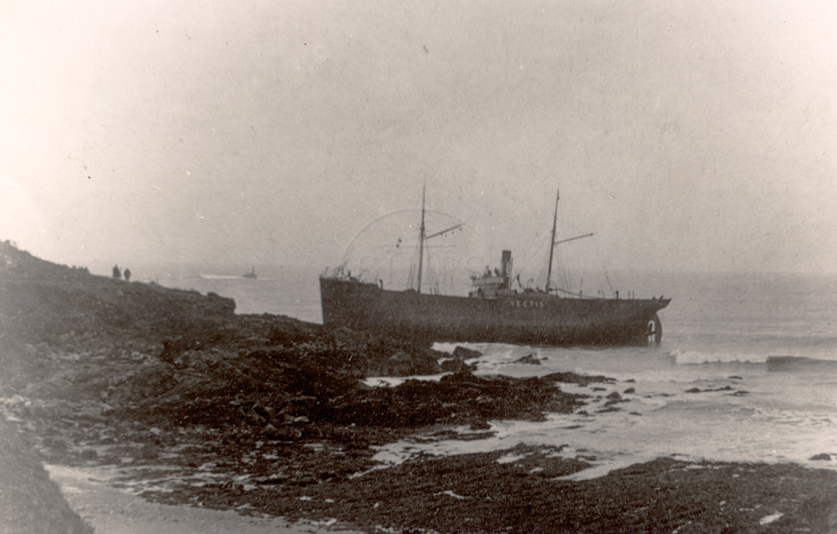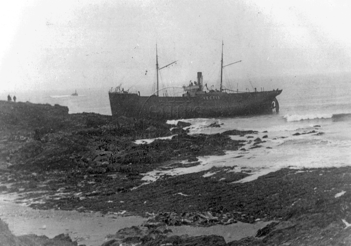 Rocks on both sides of the forehold had penetrated the bottom plates of the Vectis and she was rapidly taking on water, it was high tide and there was a ground swell running. The Vectis ended up on the shore on an even keel, cradled between rocks on each side and with rocks at her stern.