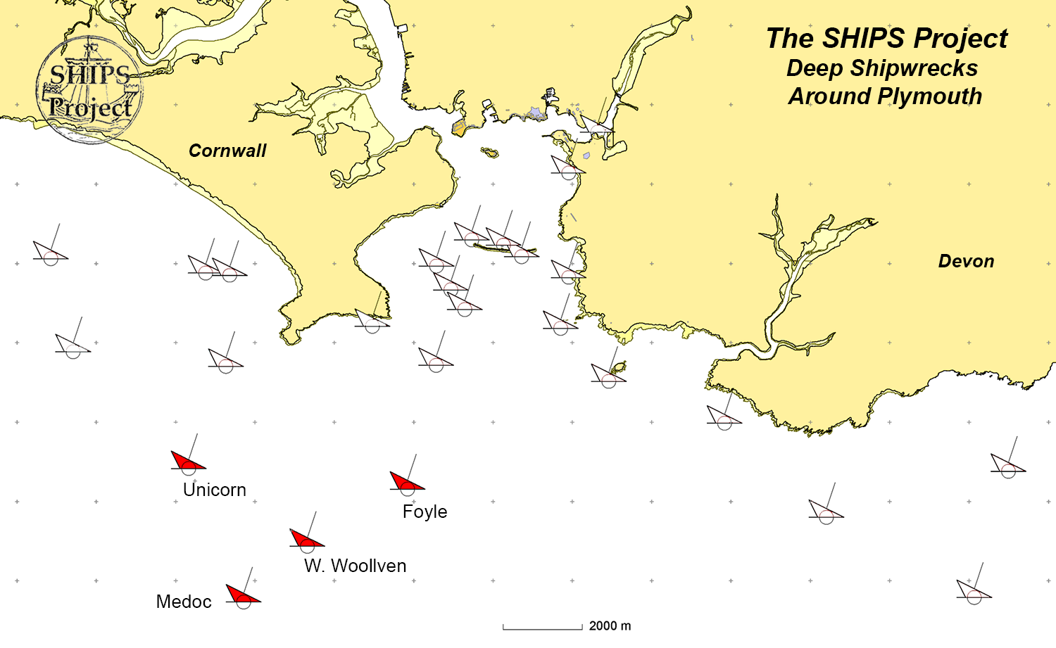 The map shows the shipwrecks in more than 50m depth that are near Plymouth, UK.