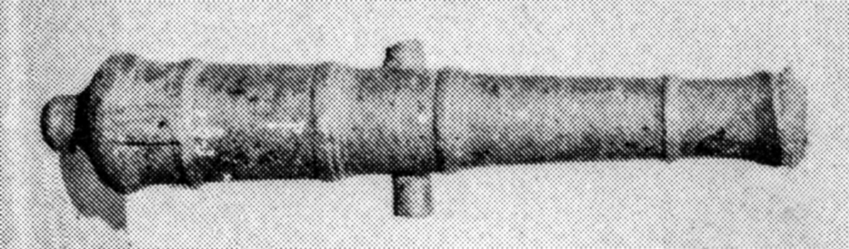 A discussion about the origin of the gun is discussed in the report on pages 408 to 410. The report goes on to say that: 'Bearing in mind that this was charged with powder and shot drives us to the conclusion that the vessel carrying it inside the harbour must have been engaged in actual warfare; since the gun has evidently been dismounted by a longitudinal shot; for on examination it is clearly seen that it has received on one side a heavy blow on the muzzle, trunnion and breech.'