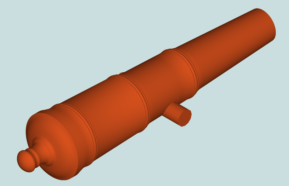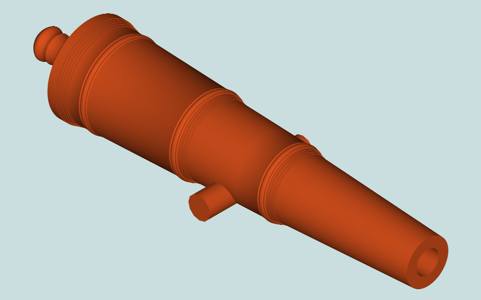 The drawing of the gun was rendered in 3D to show the overall shape, the position of the trunnions and the smooth form of the breech: