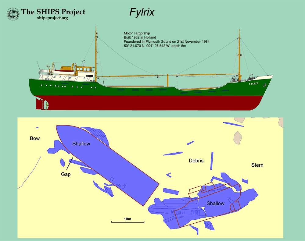 By February 1985, the ship had been declared a constructive total loss, and in April, she was sold to the salvage company P.R. Eurosalve. A big storm in 1987 did a lot of damage to the wreck, as well as destroying the café on Jennycliff beach. By 1988, the hull was slowly being flattened by divers from Plymouth Ocean Projects (POP) at Fort Bovisand, who used her for underwater explosives training courses. In 1989, a spokesman for POP said that the wreck would be completely dismantled within two to three years, but this job was never completed, so the Fylrix has remained a hazard to navigation ever since. On one occasion, an expensive motorboat hit the wreck, and in August 1989, a bilge keel yacht called Kate was left high and dry on the wreck when the tide went out.