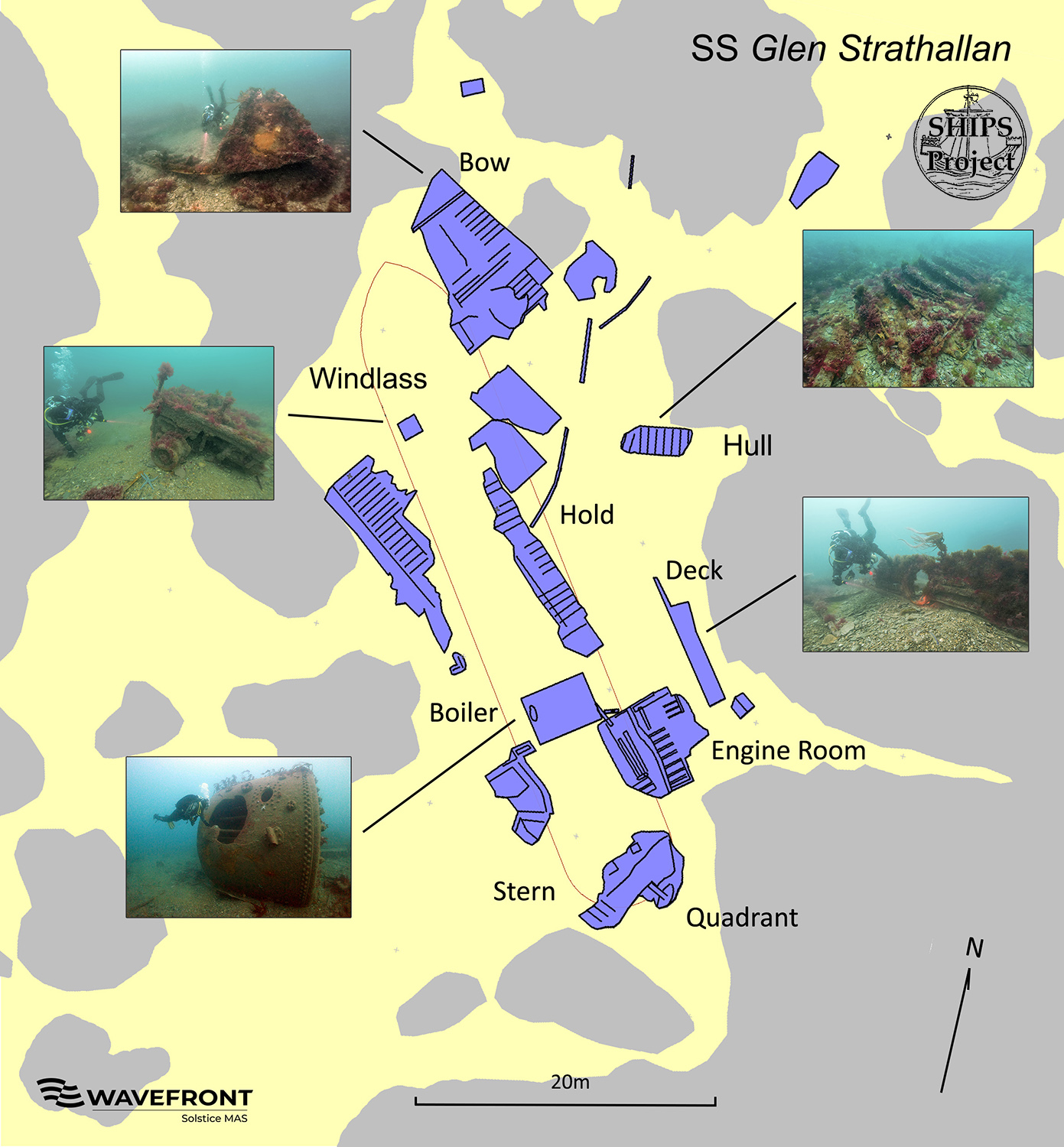 What remains of the ship is the single large boiler, part of the bows lying on its starboard side, sections of hull plating amongst the sand flats, reefs and gullies of the seabed. The site has changed a lot over the years, with the ship structure slowly collapsing, but also because the seabed itself has changed. Photographs from the 1990s show the site covered in kelp and deep sand with very little structure visible, but today both the kelp and the sand have gone, revealing a large area of iron wreckage. The boiler is the easiest to find as it stands proud of the seabed, and to the west lies the remains of the engine bed, the engine having been removed before she sank. To the south can be found the stern with wooden decking, mooring bitts and the steering quadrant that was fitted to the top of the rudder. Heading north, more structure is visible along the port side of the ship, past the boilers and over an area of bottom plating. The anchor windlass can be seen lying upside down on the sand. North again is a large structure that was the bow, lying on its starboard side with the sharp stem still clearly visible. Going south along the starboard side, you can see an area of decking turned sideways with a round hole through it for a ventilator; the wooden decking is still visible.