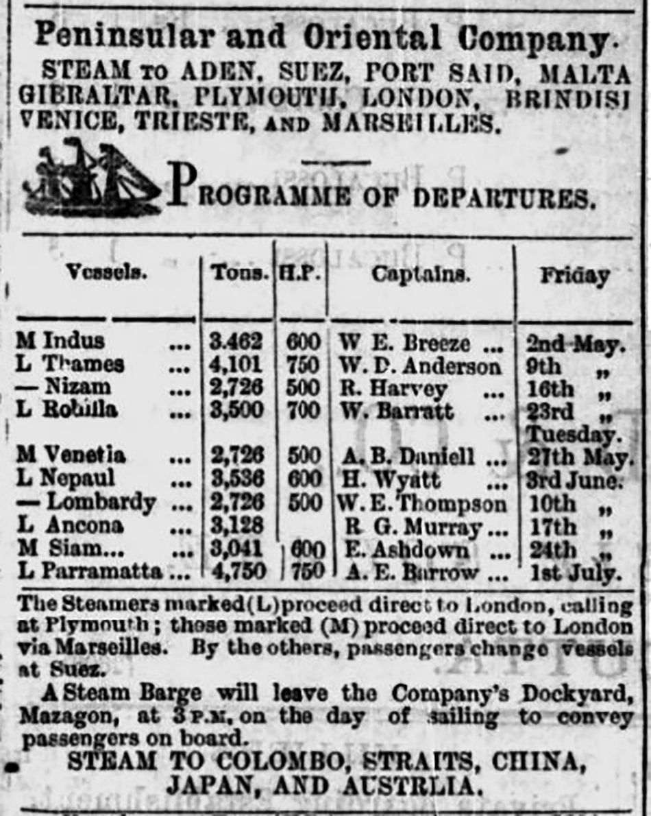 The last voyage of the Nepaul from Calcutta to London started on 7th November 1890, where she loaded 13,000 chests of tea, 1,500 bags of wheat, 1,000 bags of rice, five boxes of indigo dye, jute, dispatches, specie (money in coins) and nine passengers. She was under the command of Captain George Westrop Brady; the crew of 147 was chiefly Lascars, while the officers and engineers were European. On 4th December, she left Marseilles for London via Plymouth. On Wednesday, 10th December, at 5.10 pm, the Nepaul had passed the Lizard in Cornwall and was doing 13 knots when the lighthouse on the Eddystone rock was sighted 13 miles off. There was a light easterly wind and a slight swell, but shortly afterwards the weather became misty, and the vessel’s speed was reduced. On the approach to Plymouth, they tried to summon the pilot who should have been waiting there to guide them in, but no vessels appeared, so she carried on without. The weather then became very dark and overcast, and the speed of the vessel was reduced.