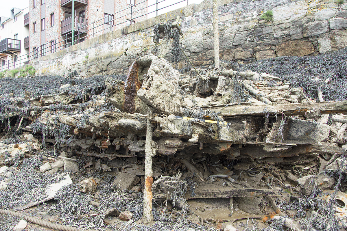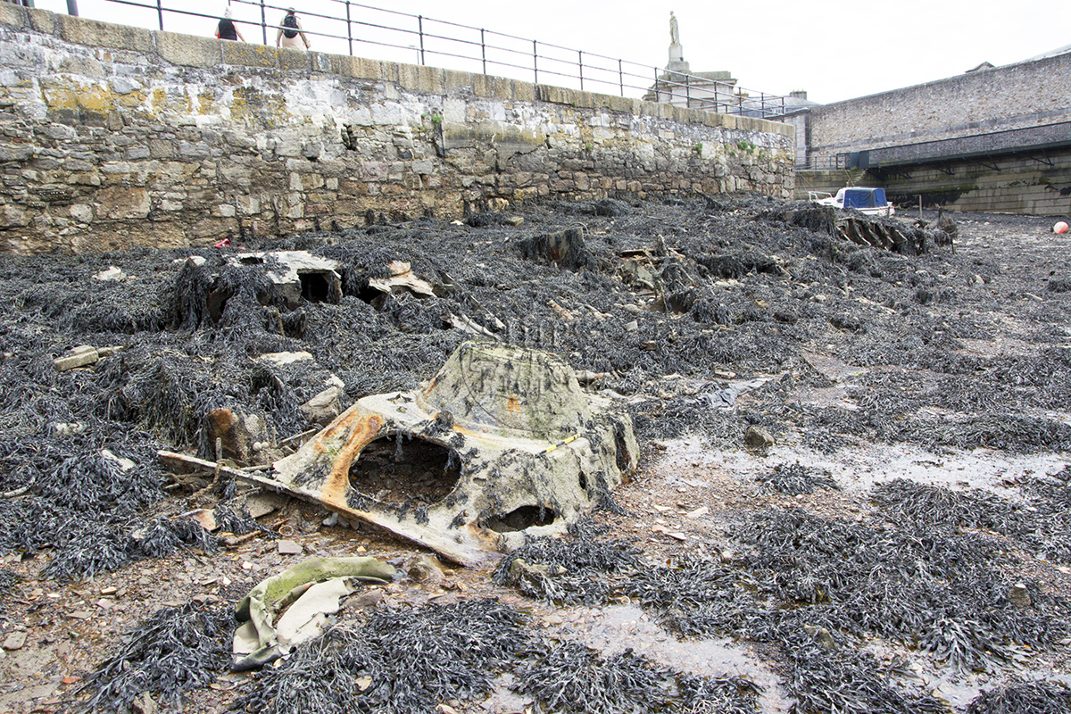 The remains of YMS-378 can be seen at low tide, hard up against the wall at Freeman's wharf, see photograph 5. The beach can be accessed via the steps alongside the Royal William Victualling Yard, the mud is deep in places so wearing wetsuit boots is advised.