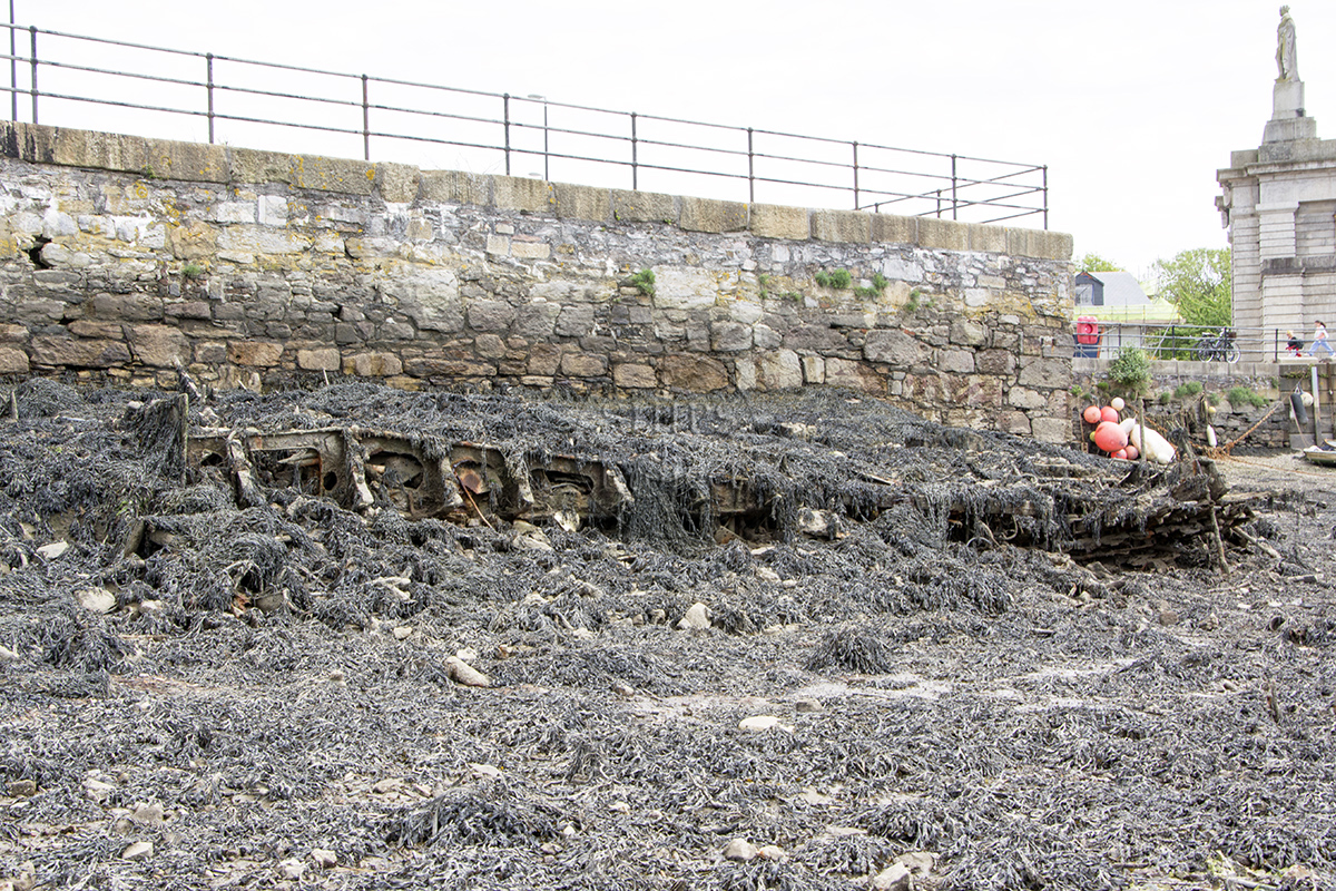 The remains of this hulk are covered in weed and a thick layer of hard concretion where rusty steelwork has fused together, but some of the structure can be identified. The few remains of her bow lies towards the north and her stern is to the south, the ship was so long that it filled the whole wharf, see the aerial photo 4 from Cyberheritage. Hull timbers can be seen at her port quarter and the large steel engine beds are still visible further forward.
