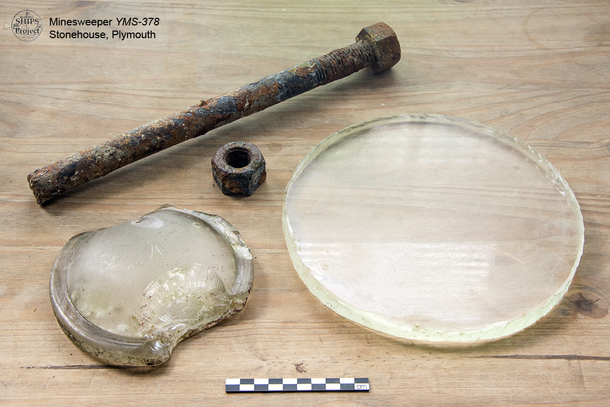 Objects found from this ship include a 240mm / 9.5in glass porthole etched with the word 'Armourplate', a 25.4mm / 1in diameter threaded bolt used to fasten the ship's timbers together and a 150mm / 6in diameter glass deck light marked with the Royal Navy broad arrow. The British-made deck light may have been fitted to the ship when she was repaired in Plymouth in June 1944 after sustaining damage from German shore batteries.